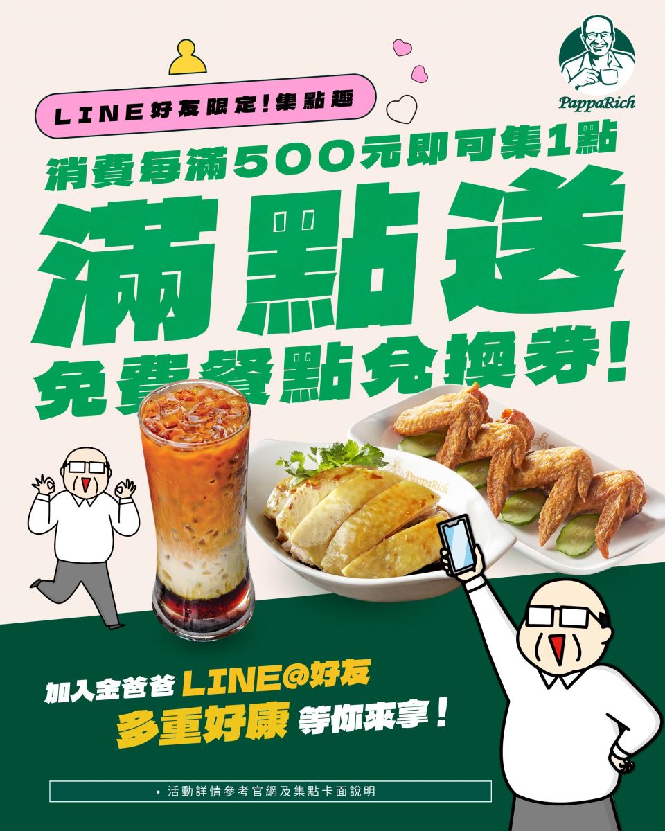 加入金爸爸LINE官方好友,凡於金爸爸消費,每滿500元即可集1點,滿點送免費餐點兌換券!
