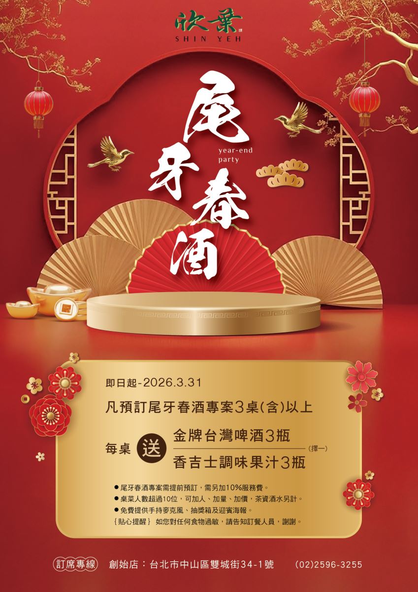 創始店尾牙春酒優惠 凡點尾牙春酒專案3桌(含)以上,招待金牌台灣啤酒或香吉士調味果汁3瓶