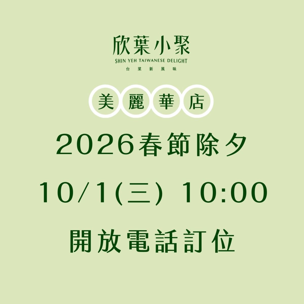 2026除夕訂位已滿,歡迎預訂春節其他時段!
