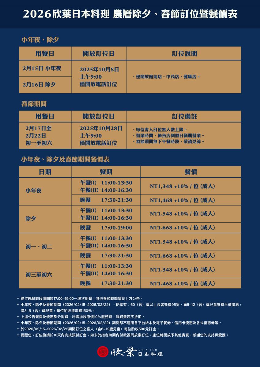 欣葉日本料理健康店 2026 農曆除夕暨春節訂位暨餐價表
