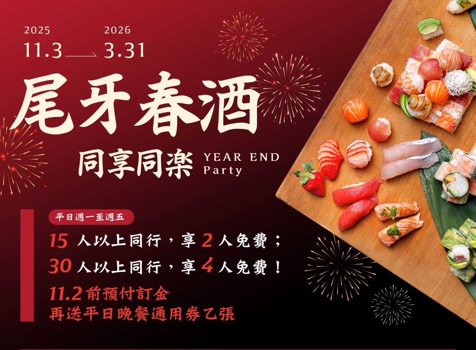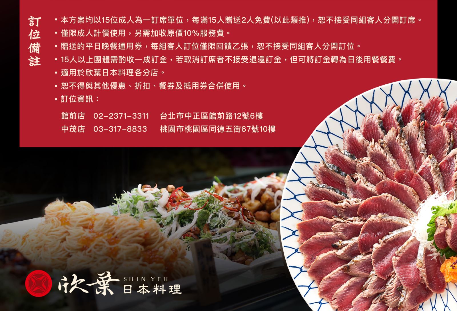 2025-2026 尾牙/春酒 同享同樂 人越多省越多 2025/11/3 至 2026/3/31 平日滿15人以上同行,享2人免費 平日滿30人以上同行,享4人免費 早鳥預訂加贈餐券乙張 2025/11/2前預付訂金,享早鳥優惠 贈欣葉日本料理平日晚餐通用券乙張 Shinyeh Japanese欣葉日本料理 館前店:(02)2371-3311(交通地圖) 健康店:(02)2766-3666(交通地圖) 中茂店:(03)317-8833(交通地圖)