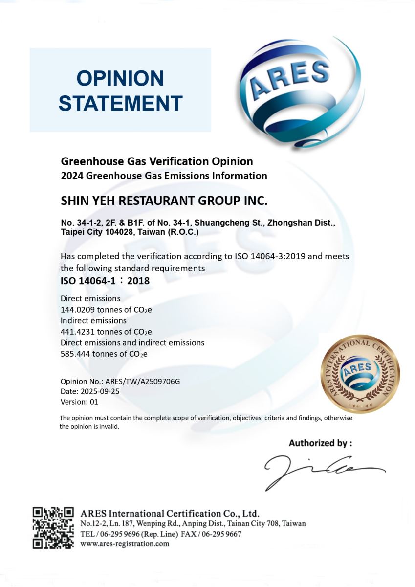 欣葉國際餐飲集團首次通過 ISO 14064-1 溫室氣體盤查查證。